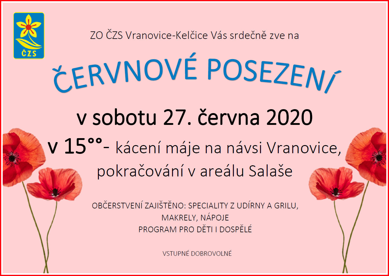 ZO ČZS Vranovice-Kelčice Vás srdečně zve v sobotu 27.června na "Červnové posezení". Akce začíná v 15:00 hodin na návsi ve Vranovicích. Občerstvení zajištěno. Vstupné dobrovolné.