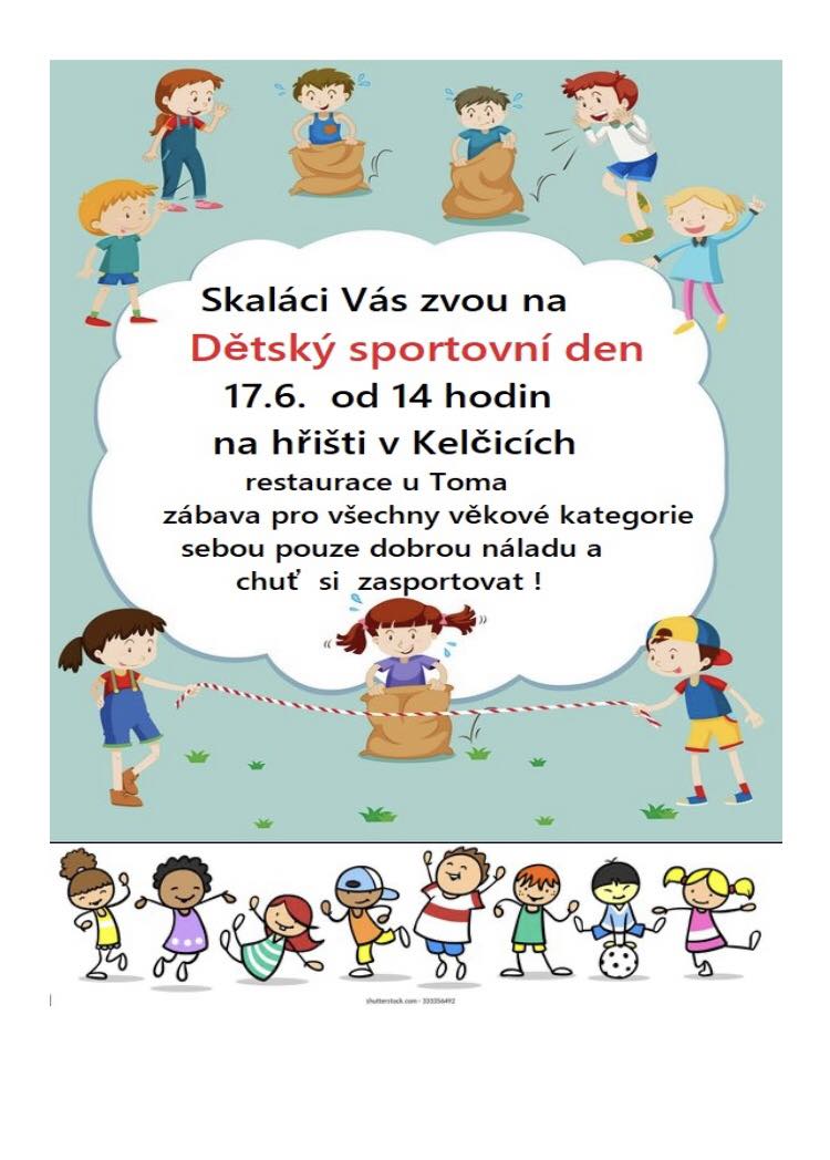 Spolek Na Skale Vás srdečně zve na Dětský sportovní den. Akce se uskuteční v sobotu 17.června na hřišti v Kelčicích (restaurace U Toma ).