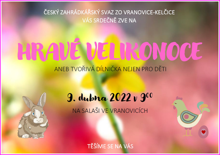ČZS ZO Vranovice-Kelčice Vás srdečně zve v sobotu 9.dubna v 9:00 hodin na HRAVÉ VELIKONOCE, aneb tvořivou dílničku nejen pro děti.