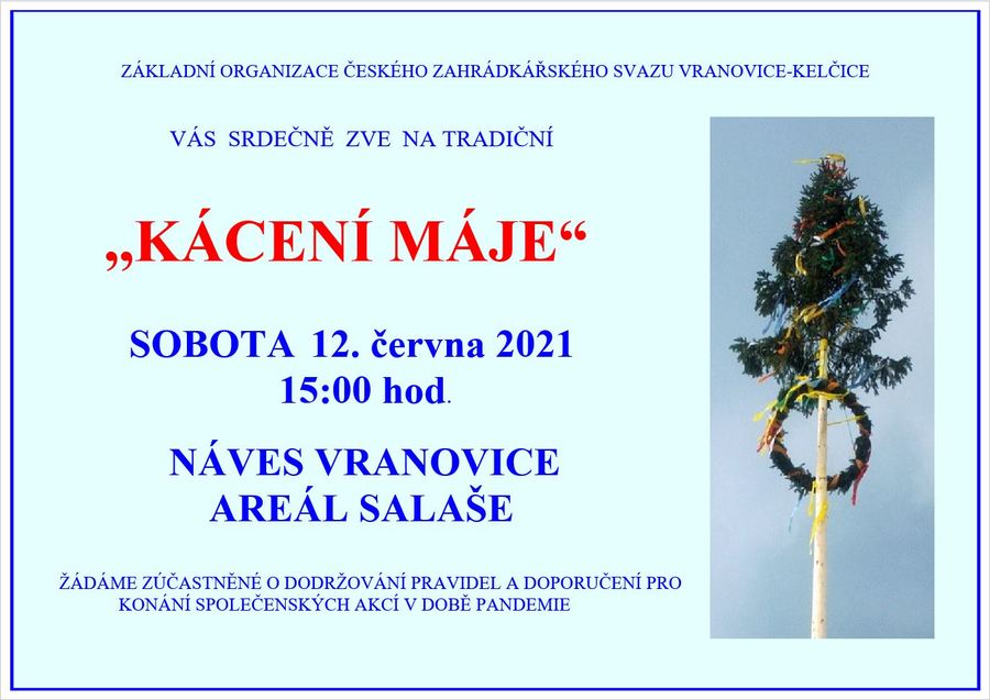 ČZS ZO Vranovice-Kelčice Vás srdečně zve v sobotu 12. června v 15:00 hodin na tradiční Kácení máje.