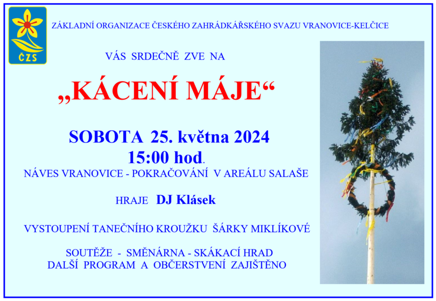 ČZS ZO Vranovice - Kelčice Vás v sobotu 25. května srdečně zve na KÁCENÍ MÁJE.