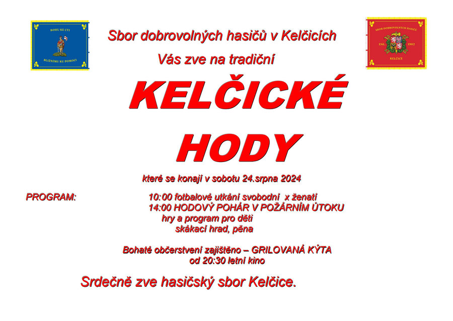 Sbor dobrovolných hasičů v Kelčicích Vás srdečně zve na tradiční Kelčické hody, které se konají v sobotu 24. srpna 2024.
