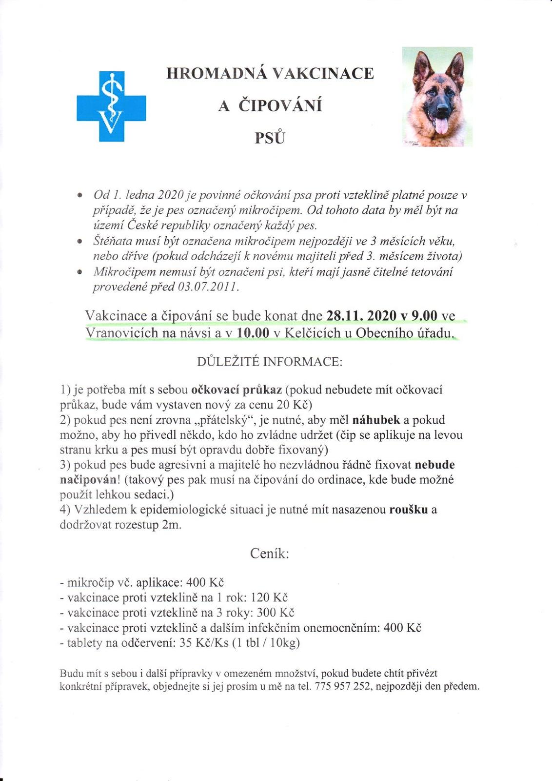 Očkování psů proti vzteklině se uskuteční v sobotu 28. 11. 2020