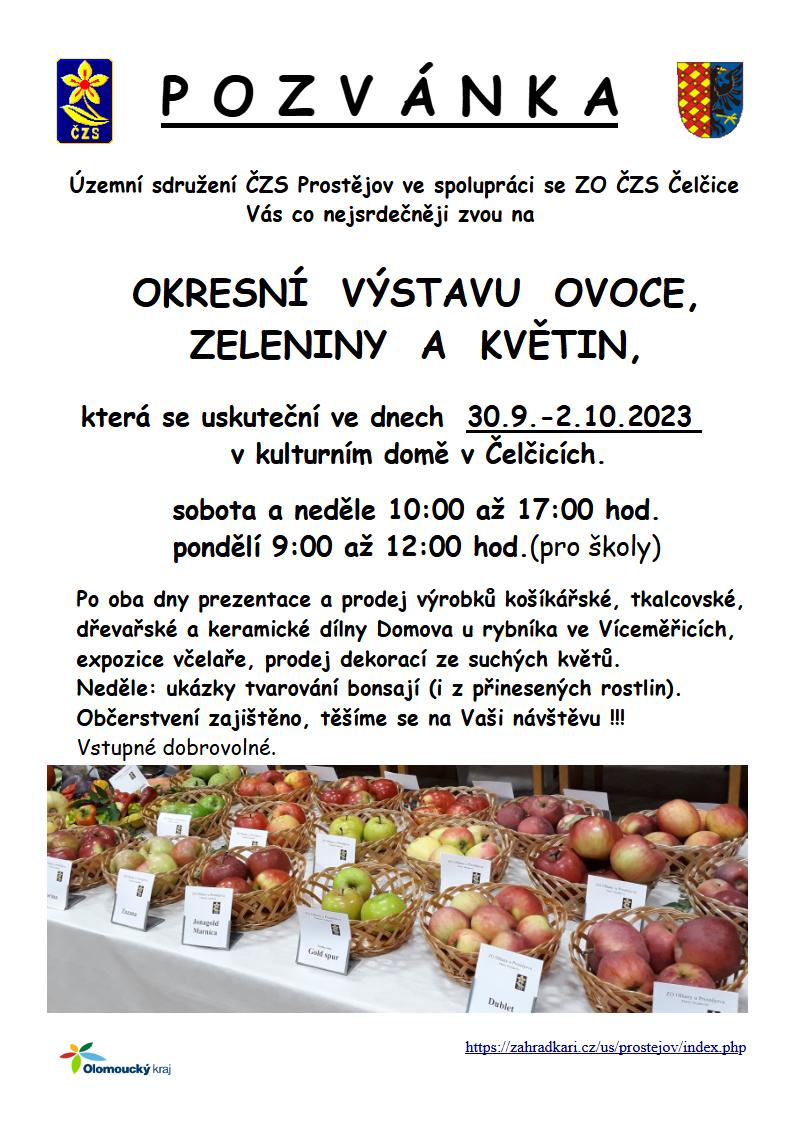Pozvánka na Okresní výstavu ovoce, zeleniny a květin. Výstava se koná ve dnech 30.9. a 1.10.2023 v kulturním domě v Čelčicích.