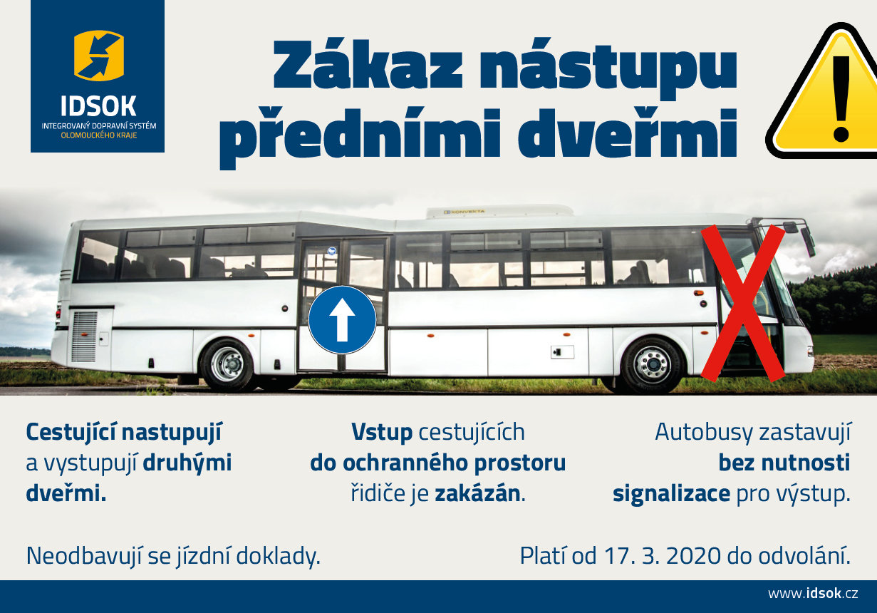 Od zítřka 17.3 2020 platí zákaz nástupu předními dveřmi jak u autobusů MHD, tak i u příměstských linek IDSOK. Neodbavují se jízdní doklady.