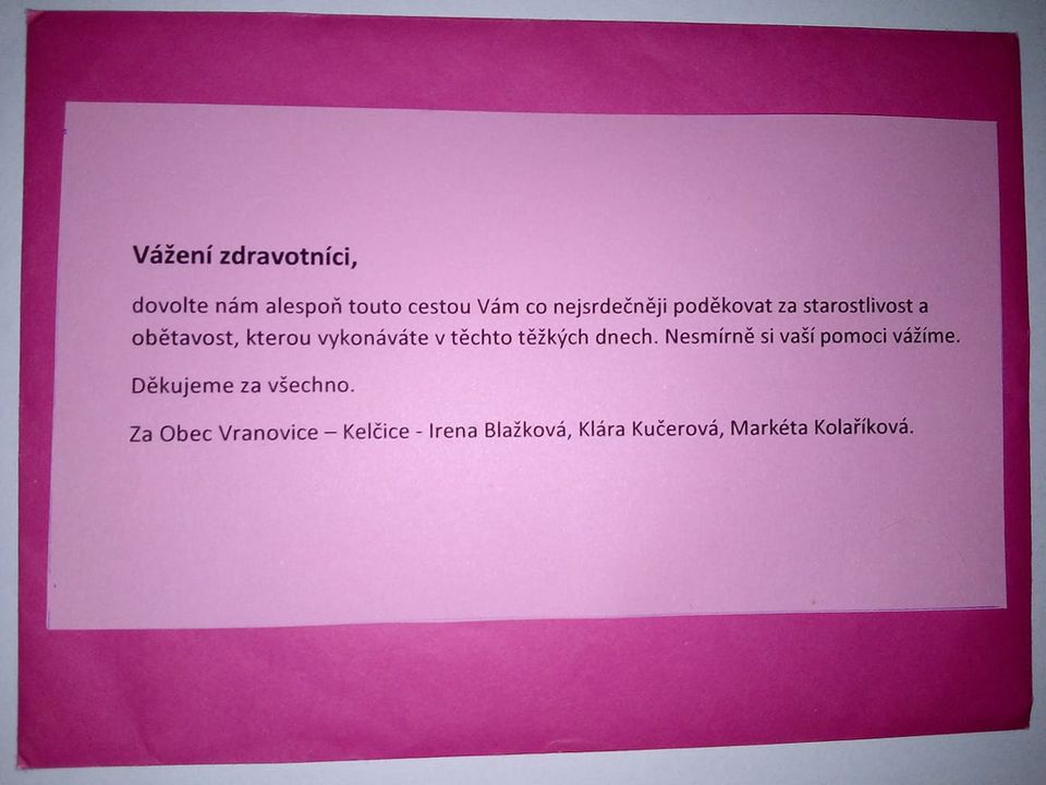 Všichni moc dobře víme, že tato doba je pro všechny velmi těžká, stresující a náročná, nejhorší zatěžkávající zkoušku zažívá naše zdravotnictví. A právě proto paní Kristýna Hlaváčová na sociální síti zrealizovala nápad poděkovat zdravotníkům. K této výzvě se s radostí připojila i naše paní starostka Irena Blažková a společně s Klárou Kučerovou a Markétou Kolaříkovou poděkovaly zdravotníkům za jejich starostlivost a obětavost. Nesmírně si jejich pomoci všichni vážíme a ceníme.