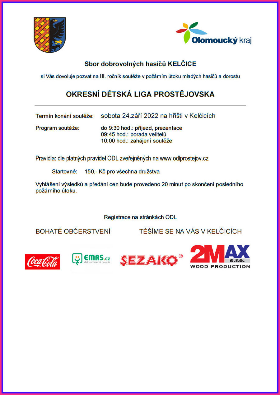 Sbor dobrovolných hasičů Kelčice Vás srdečně zve v sobotu 24. září na III.ročník soutěže v požárním útoku mladých hasičů a dorostu.