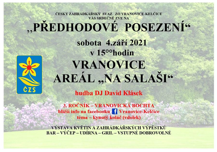 ČZS ZO Vranovice-Kelčice Vás srdečně zve v sobotu 4.září v 15:00 na tradiční "Předhodové posezení" v areálu "Na Salaši".