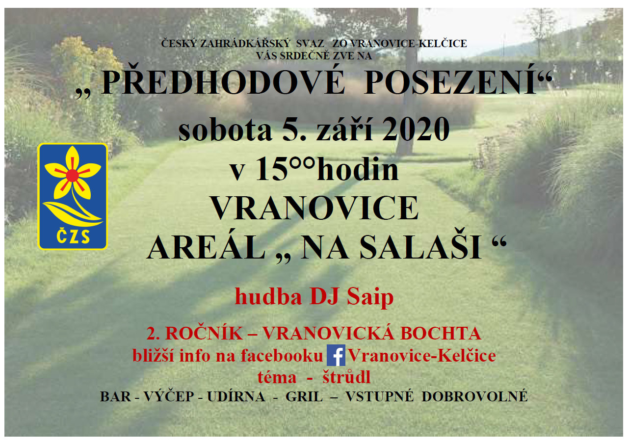 ČZS ZO Vranovice-Kelčice Vás srdečně zve v sobotu 5.září v 15:00 hod. na Předhodové posezení ve Vranovicích, v areálu Na Salaši.