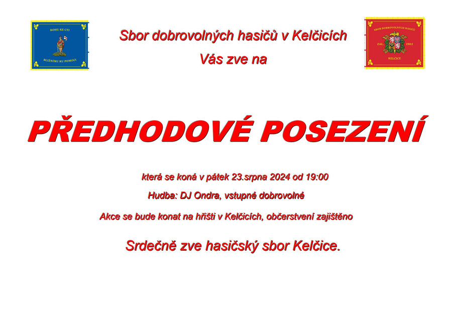 Hasičský sbor Kelčice Vás srdečně zve na Předhodové posezení, které se koná v pátek 23. srpna 2024 od 19:00 hodin na hřišti v Kelčicích.