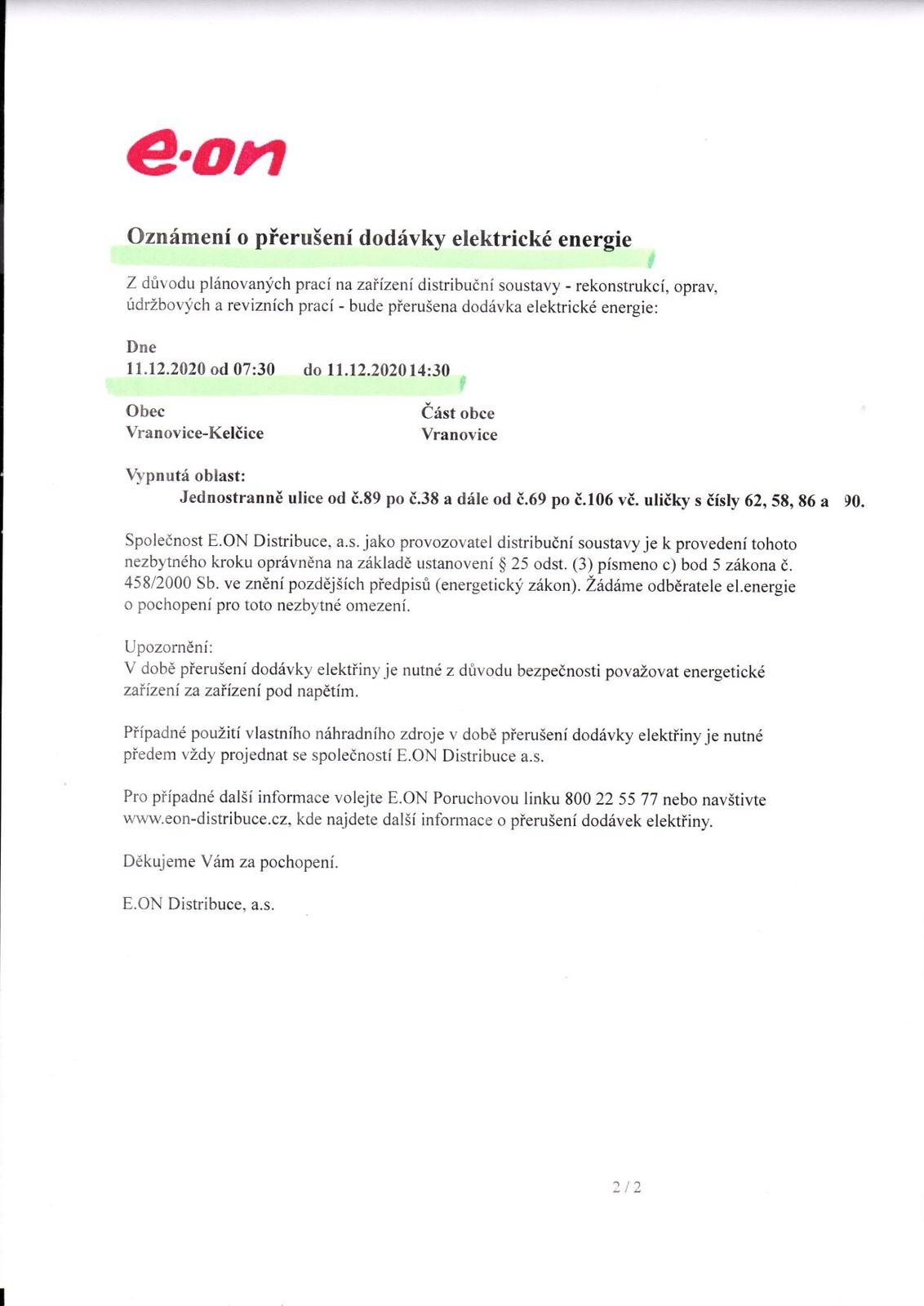 O obci > Aktuality > Přerušení dodávky elektrické energie - Vranovice - 11. 12. 2020