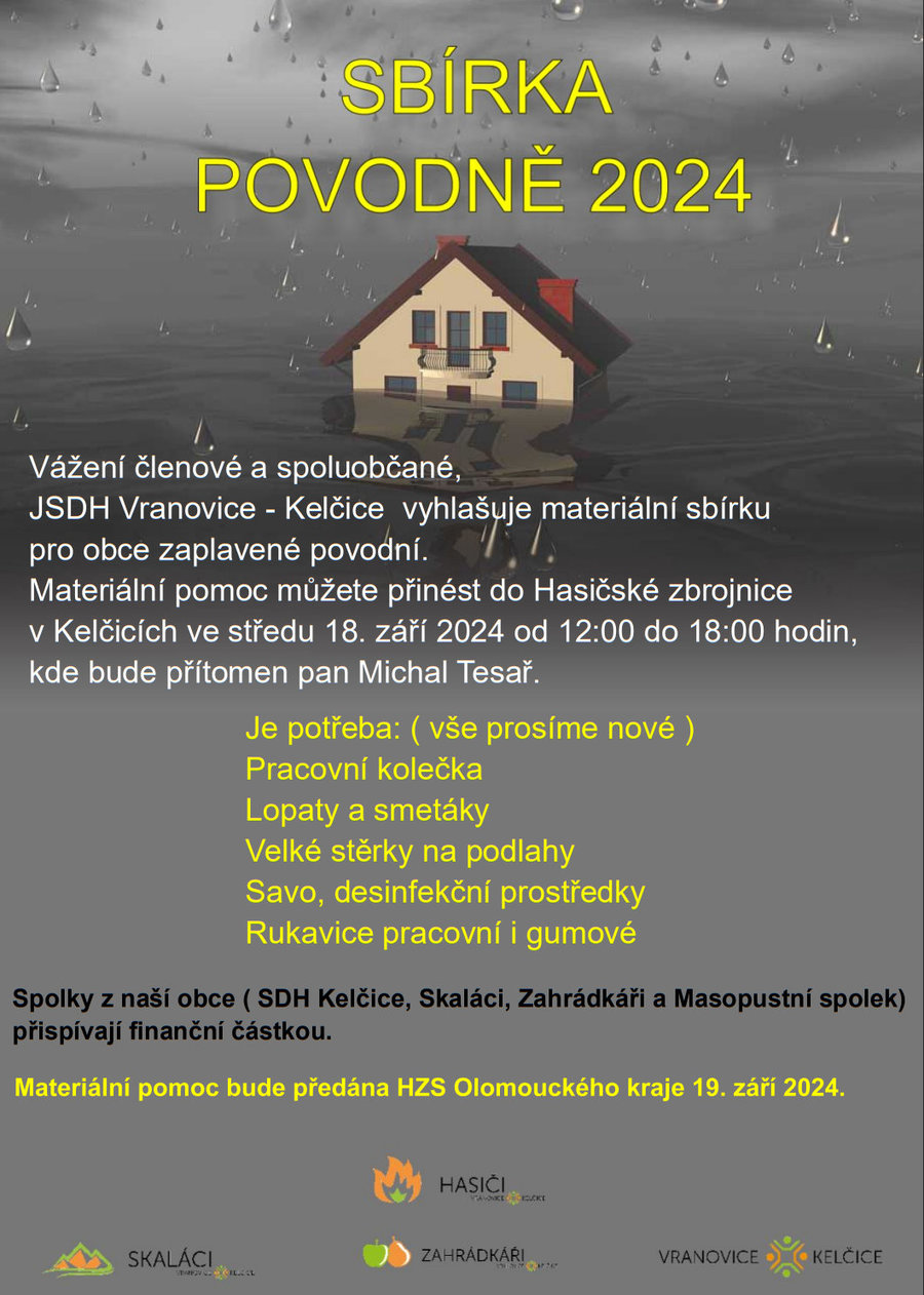 SDH Vranovice - Kelčice vyhlašuje materiální sbírku pro obce zaplavené povodní.