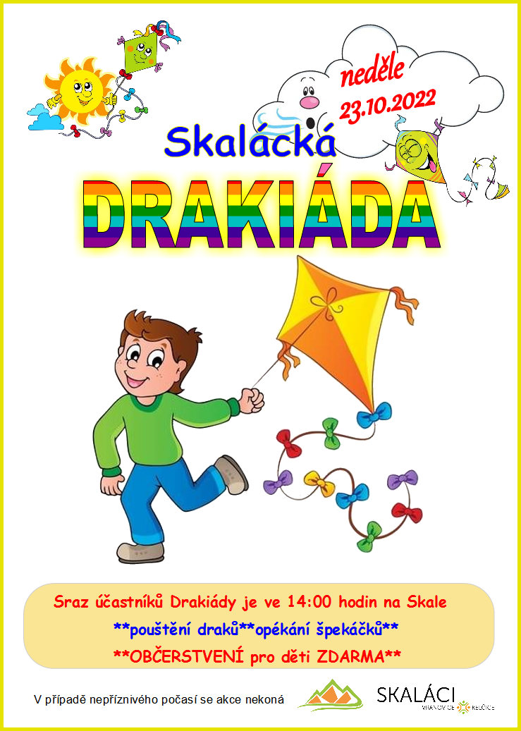 Spolek Na Skale Vás srdečně zve na další ročník Skalácké drakiády, která proběhne v neděli 23. října. Sraz účastníků je ve 14:00 hodin na Skale.