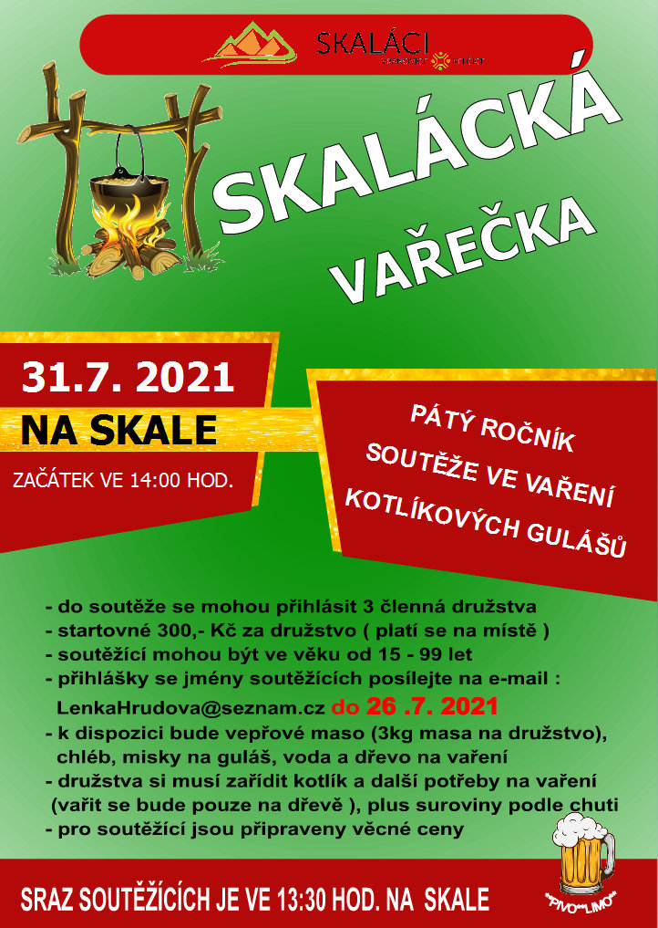 Spolek Na Skale Vás srdečně zve na pátý ročník soutěže ve vaření kotlíkových gulášů. Soutěž se koná v sobotu 31.7. 2021 od 14:00 hodin na Skale. Informace najdete na přiloženém letáčku.