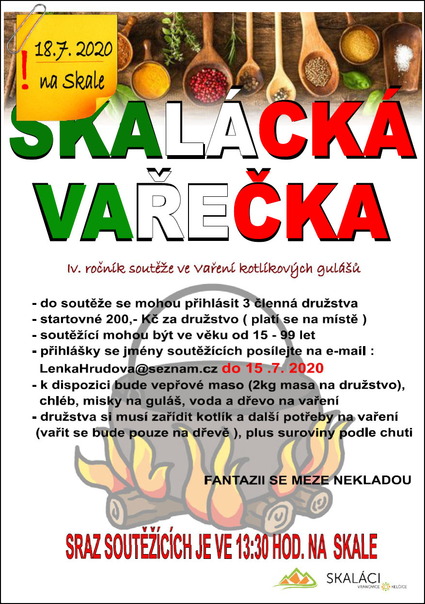 Skaláci Vás srdečně zvou na 4.ročník soutěže ve vaření kotlíkových gulášů. Akce se bude konat v sobotu 18. července 2020. Bližší informace najdete na letáčku.