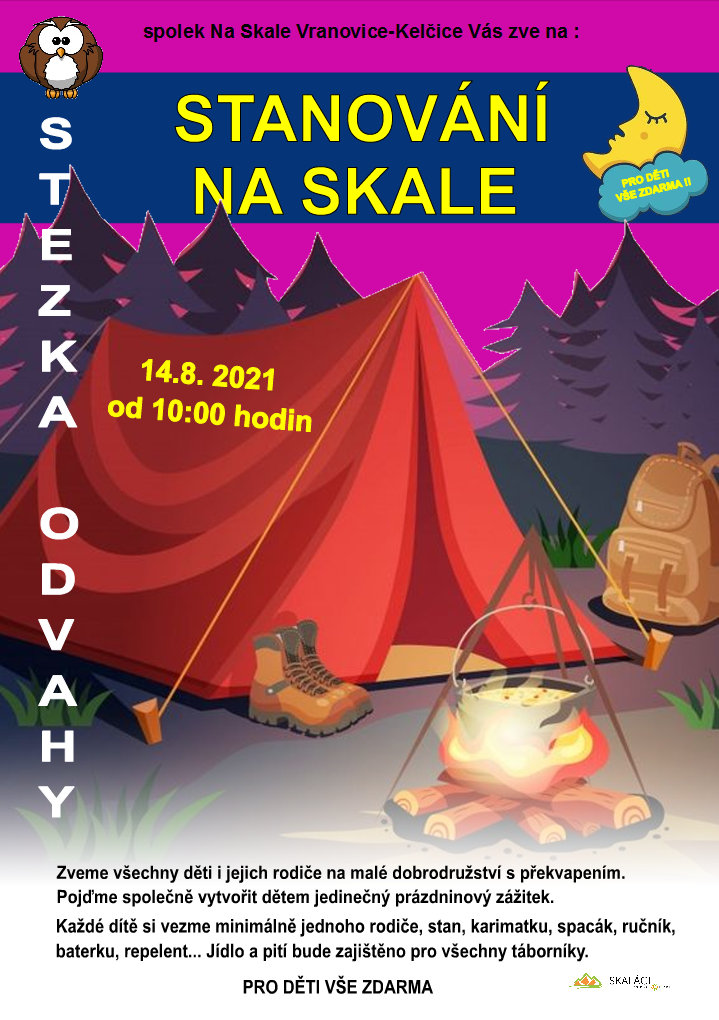 Spolek Na Skale zve děti na oblíbené víkendové stanování. Oblíbená akce začíná v sobotu 14. srpna v 10:00 hodin na Skale. Pro děti je vše zdarma. Jídlo a pití je zajištěno pro všechny táborníky.