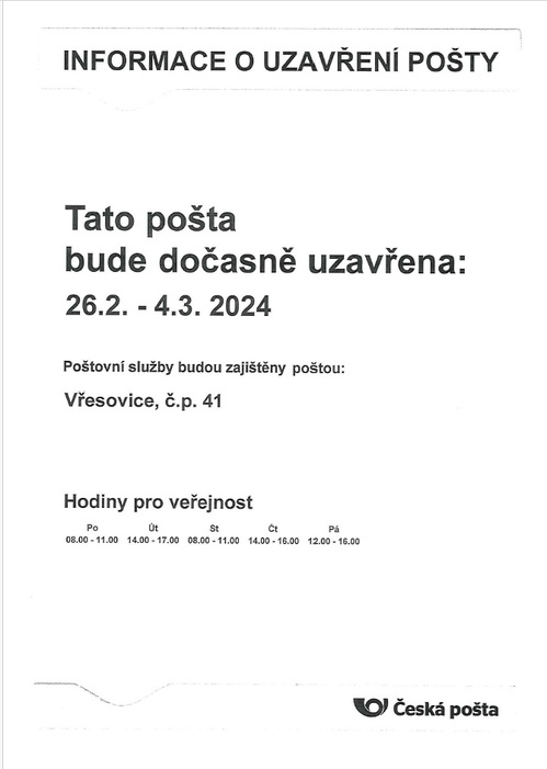 Služby zajistí pošta Vřesovice, č.p. 41.