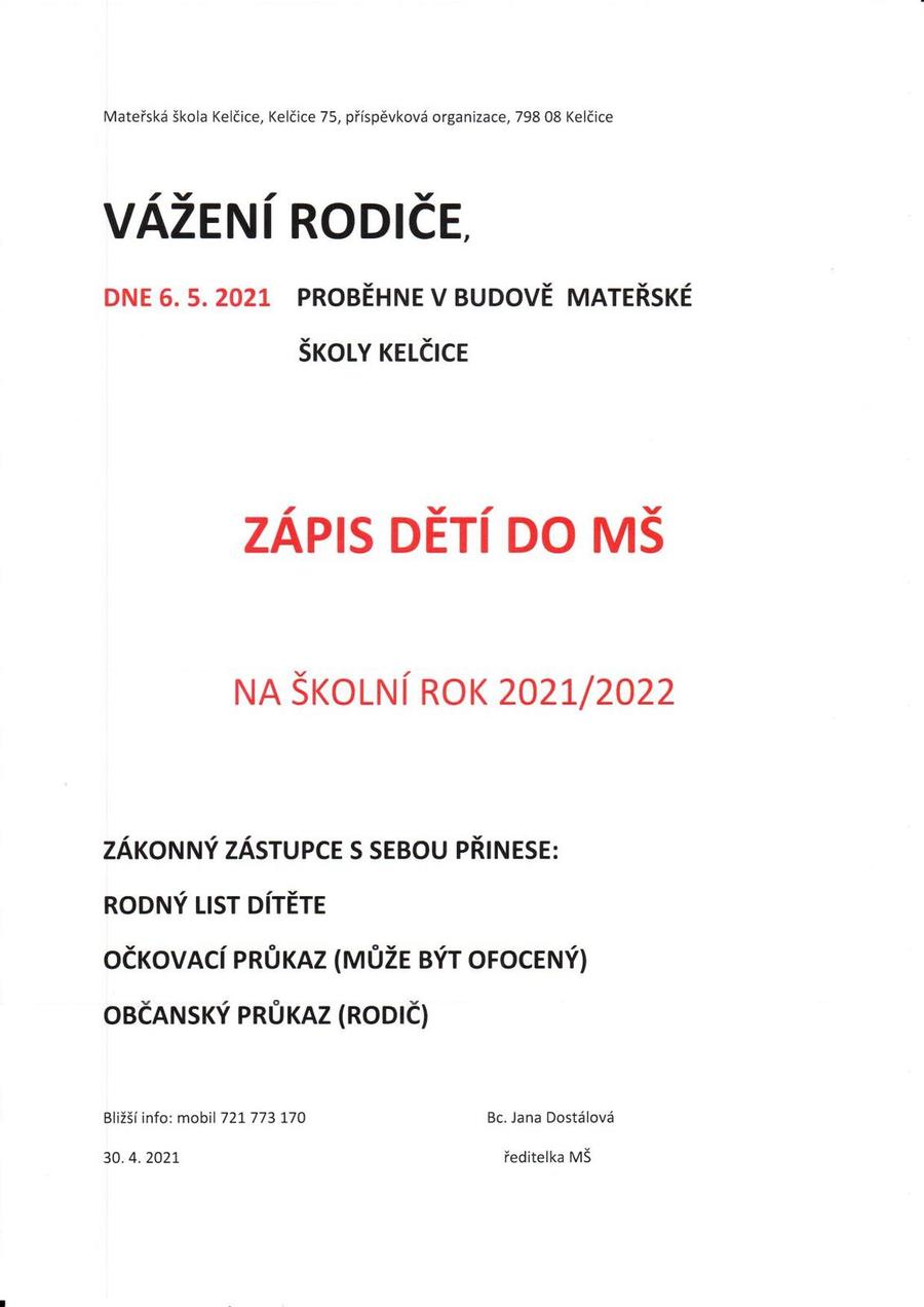 O obci > Aktuality > Zápis dětí do MŠ - 6. 5. 2021