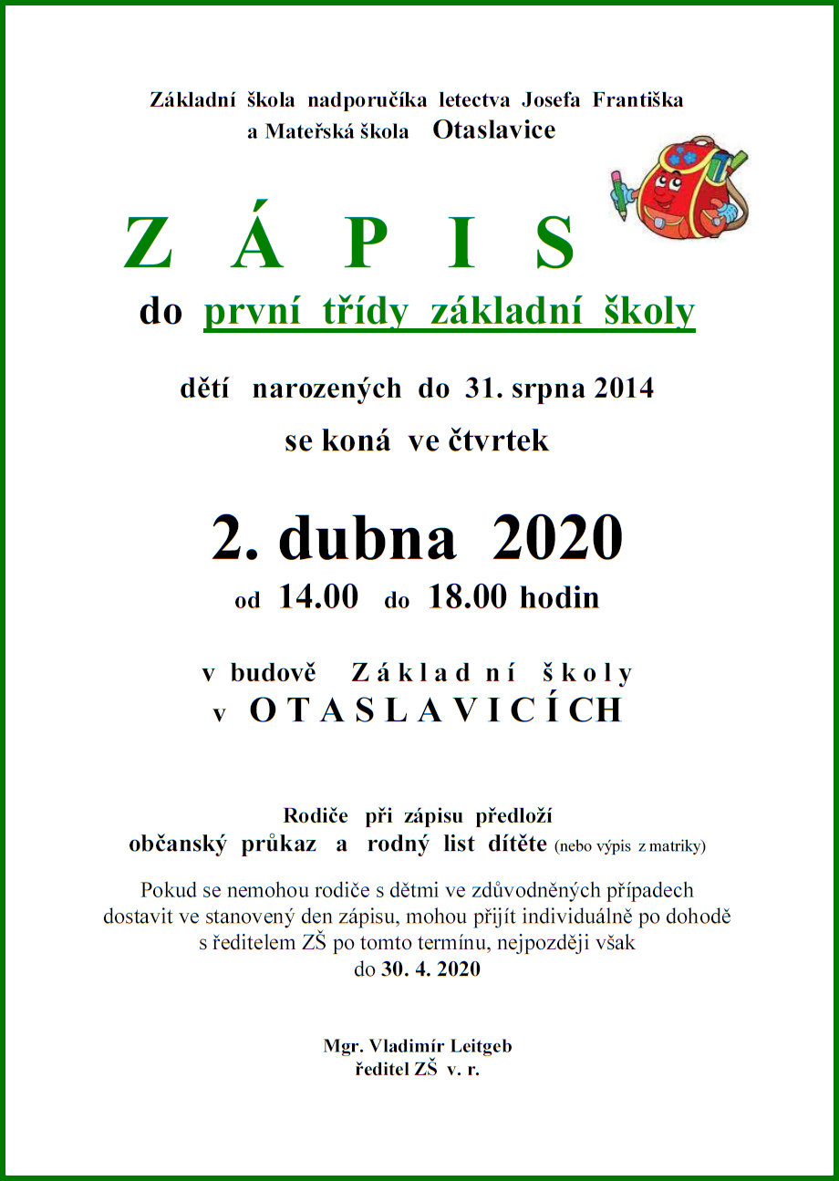 O obci > Aktuality > Zápis do 1.ročníku ZŠJF Otaslavice - ZRUŠENO