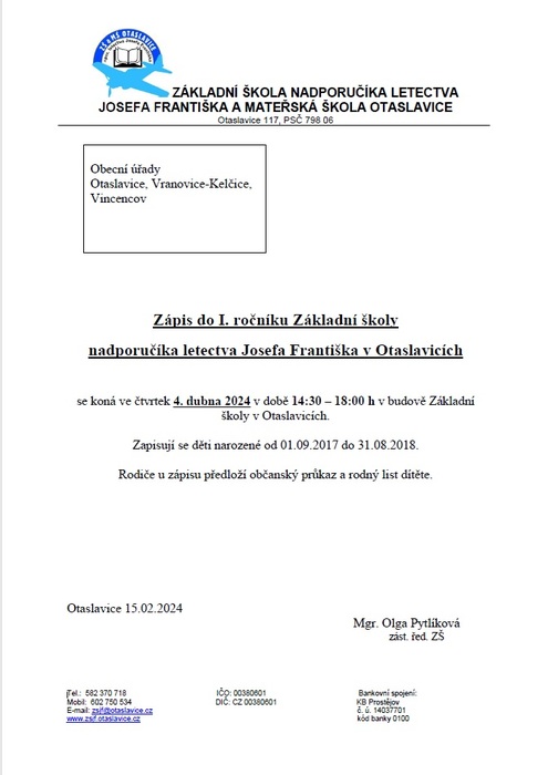 se koná ve čtvrtek 4. dubna 2024 v době 14:30 – 18:00 h v budově Základní školy v Otaslavicích.