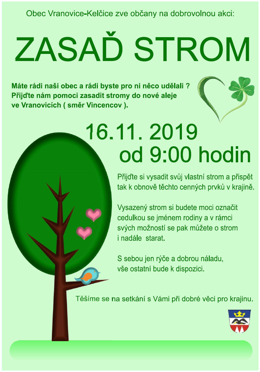 Obec Vranovice-Kelčice Vás srdečně zve na dobrovolnou akci s názvem Zasaď strom.