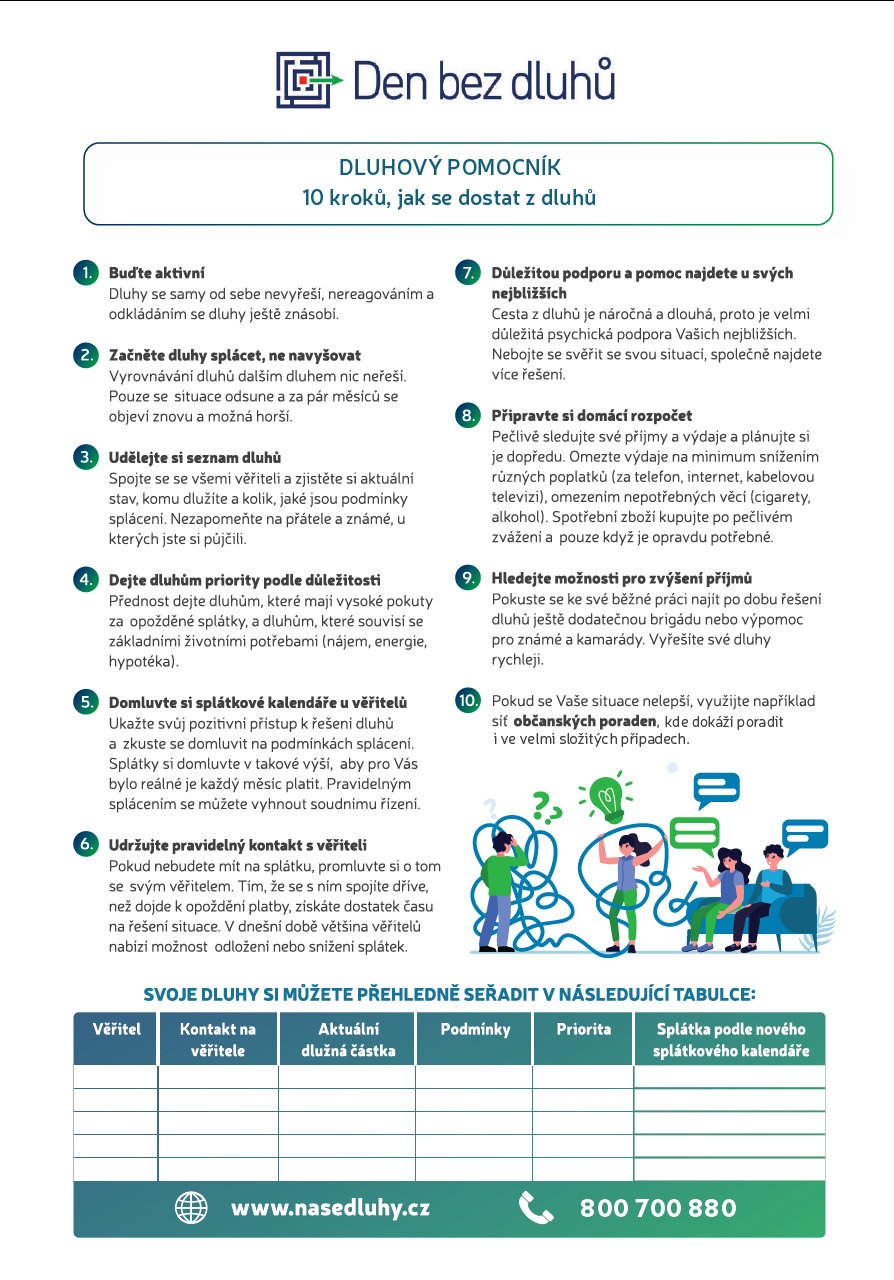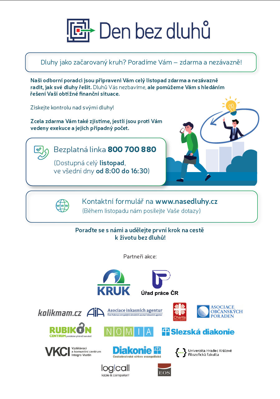 „Zájemci o bezplatné poradenství mohou pokládat otázky na stránkách www.nasedluhy.cz a současně budou odborníci společnosti KRUK připraveni na dotazy na bezplatné telefonní lince 800 700 880. Zůstává i nabídka poskytování zdarma výpisu z Centrální evidence exekucí, kde zájemci zjistí, jestli je proti nim vedena exekuce a případně jejich počet. Nově bude určeno zdarma poradenství i občanům Ukrajiny“.